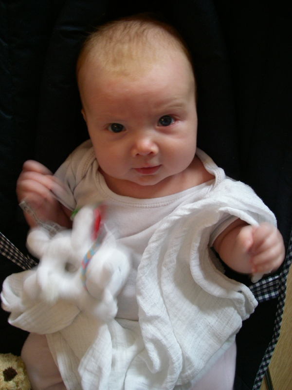What we’ve done so far is to decide on 8pm for when ‘night starts’ – lights go down low or get switched off, we start to speak quietly and if the telly or radio is on we turn the volume down. Jessica’s unfortunately not regular yet with the times when she wants her day and evening feeds, but 8 pm seems a good time to start preparing for the night – for the last week or so her penultimate feed has been around 6-7pm and as she’s asked for her last feed only about 1-2 hours after that (she’s always seemed hungrier in the evenings), we want to make sure she’s all ready for bed when that happens. So after 8pm we change her nappy and clothes, then Ian sings to her for a while, while I prepare the bedrooom (bringing the nightlight through from charging in the study, pulling down the blinds and curtains, and folding her blanket back in her cot). Then when she’s ready for something to eat, Ian brings her through to the bedroom, where I first give her a bottle of milk I’ve expressed earlier (usually in the early hours of the morning when I seem to produce more milk than she needs – isn’t it bizarre…) and then breastfeed her until she’s full.
