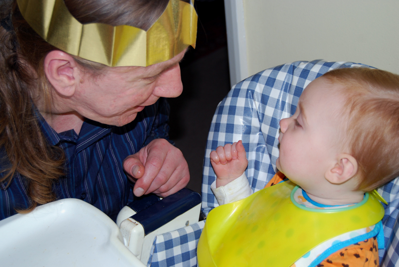 The day went really well. Jessica enjoyed all the attention she got, of course, and seemed to like her Christmas lunch, which was boiled Quorn-mince with sweetcorn, baked potato, cream and cheese followed by half a banana and some mandarin pieces. (By the way, only a few days earlier she started eating banana the same way most grown-ups do, although one of us holds it for her and she sometimes tries to take bites that are a little bit too big for her. It’s nice to see her practising her biting and chewing, although she’s only got a little bit of a tooth yet.) The Quorn-mince was a first for her. Jessica was happy and cheerful throughout lunch but when crackers were being pulled, the noise startled her and she started to cry. It didn’t take long for her to be put at ease again, though.