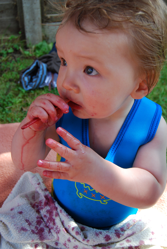 There were several children there, two actually younger than Conrad (Cameron, Daisy’s one-month-old brother, who spent most of the party asleep indoors, and Riley, a party guest at the tender age of 6 months, who snoozed away in his pushchair in the shade), and various trikes and toy bikes had been brought out into the garden. Conrad was especially keen on a battery-driven 3-wheel motorbike, which started up when one put ones feet on the foot rests (thereby pressing a switch on the right pedal) and then chugged across the grass. He even lent forward, tugging at the handles as if he was trying to rev the engine and make it go faster – so cute! I had to adjust the steering for him every so often, though, so he wouldn’t end up crashing into a table, chair or another child. At one point, when I was following him around and Daisy suddenly appeared and reached out for me to pick her up, he almost ended up in one of the flower beds! Luckily – in a way – the battery was starting to run a bit flat at that point, so he wasn’t making very quick progress and I managed to catch him up just in time.
