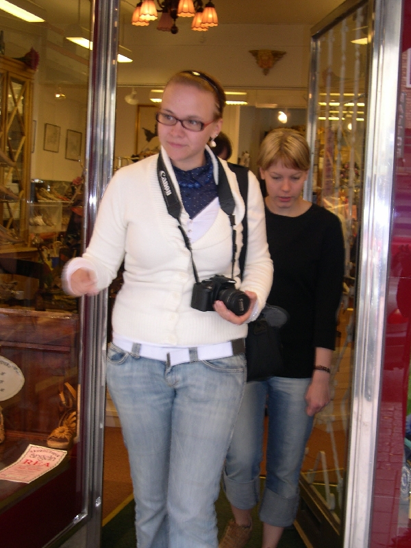 Ulrika och Päivi på väg ut ur klädbutik i Gävle. Ulrika and Päivi reappearing from clothes shop in Gävle. [foto:Gabriella]